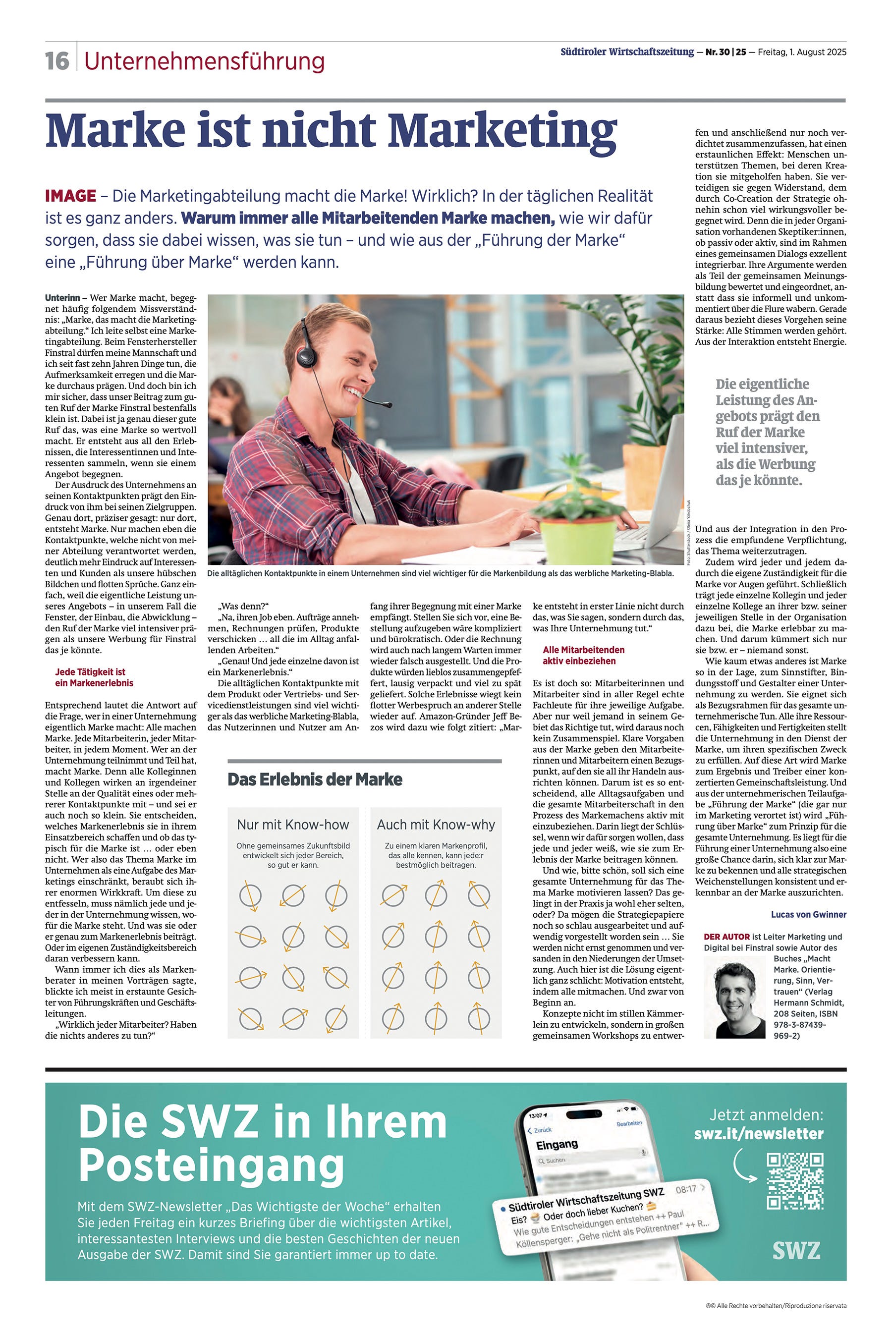 In der Südtiroler Wirtschaftszeitung. hat Lucas einen Gastbeitrag zum Thema “Marke ≠ Marketing” veröffentlicht.
