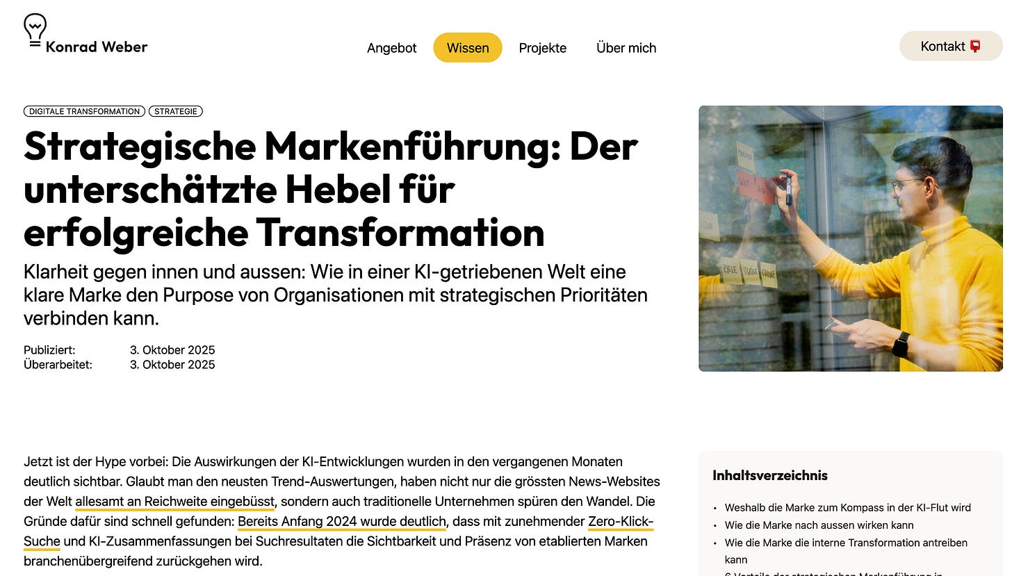 Der Schweizer Strategieberater und Coach Konrad Weber beschäftigt sich in seinem exzellenten Newsletter (und dahinter liegenden Blog) regelmäßig, ausführlich und tief mit der Transformation von Organisationen. In der aktuellen Ausgabe schaut er sich die Marke als wirksamen Treiber für Wandel an – und empfiehlt ein tolles Buch dazu ;-)