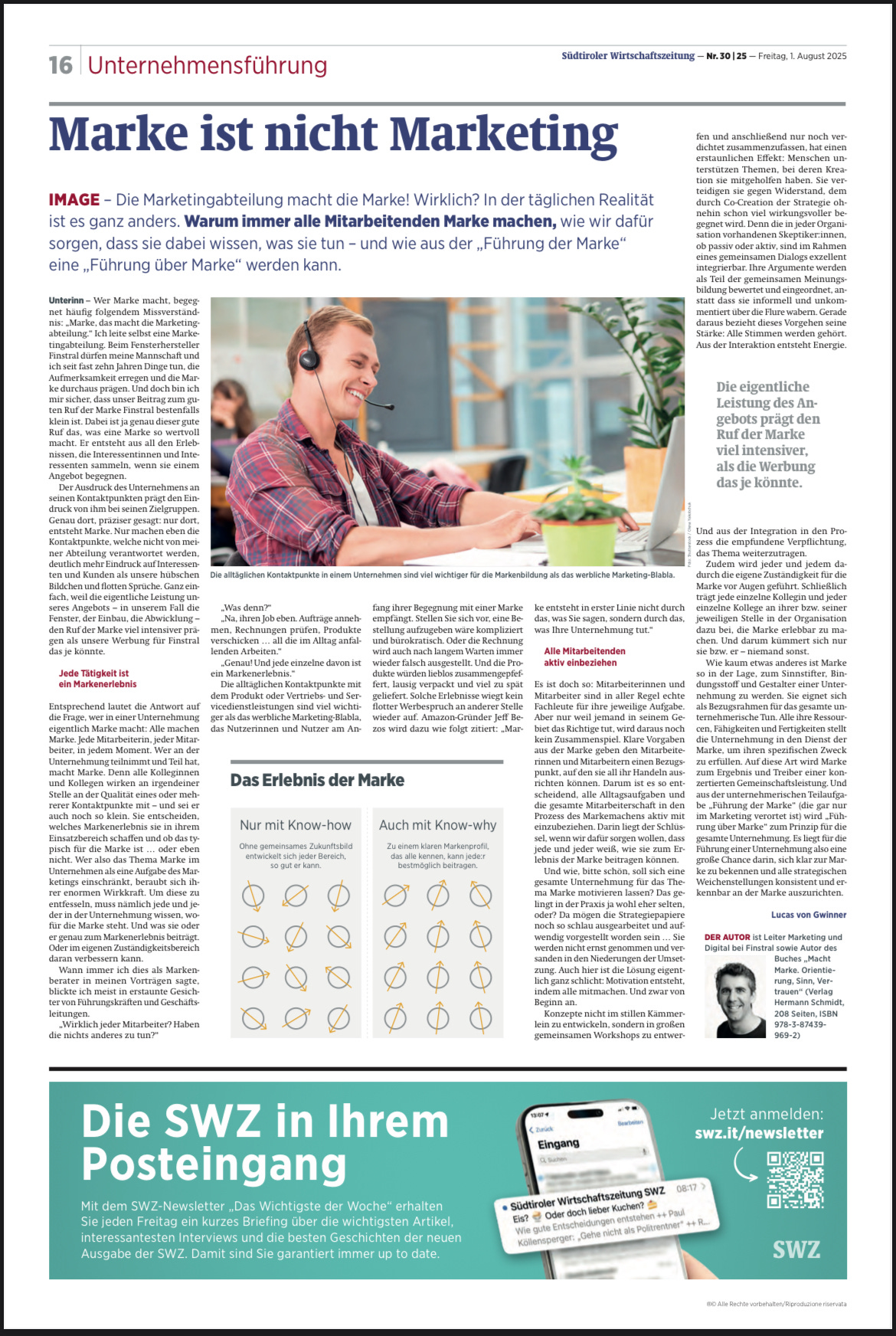 Warum ‚Marke ≠ Marketing‘ ist durfte Lucas in der Südtiroler Wirtschaftszeitung erläutern.